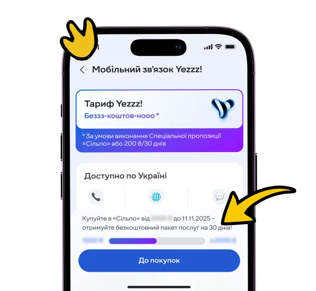 Yezzz! — це ваш шанс отримати зв’язок без оплат і перерв. Тариф діє 30 днів поспіль, а потім – легко поповнюйте, доки купуєте у «Сільпо». І, звісно, жодних прихованих плат, це не про нас!